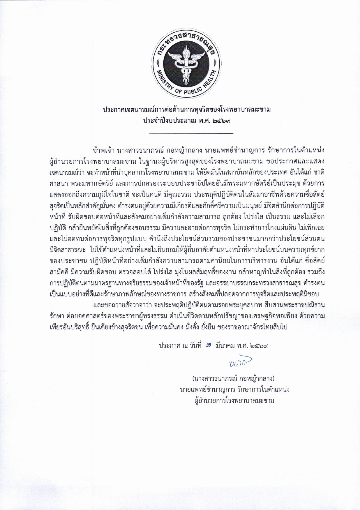 ประกาศเจตนารมณ์ต่อต้านการทุจริตปีงบ2569