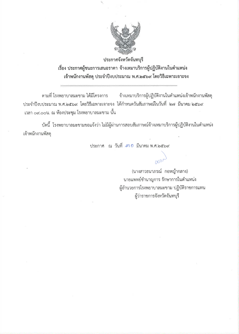 ประกาศผลการสอบสัมภาษณ์จ้างเหมาบริการผู้ปฏิบัติงานในตำแหน่งเจ้าพนักงานพัสดุ ณ วันที่ ๓๐ มีนาคม ๒๕๖๙