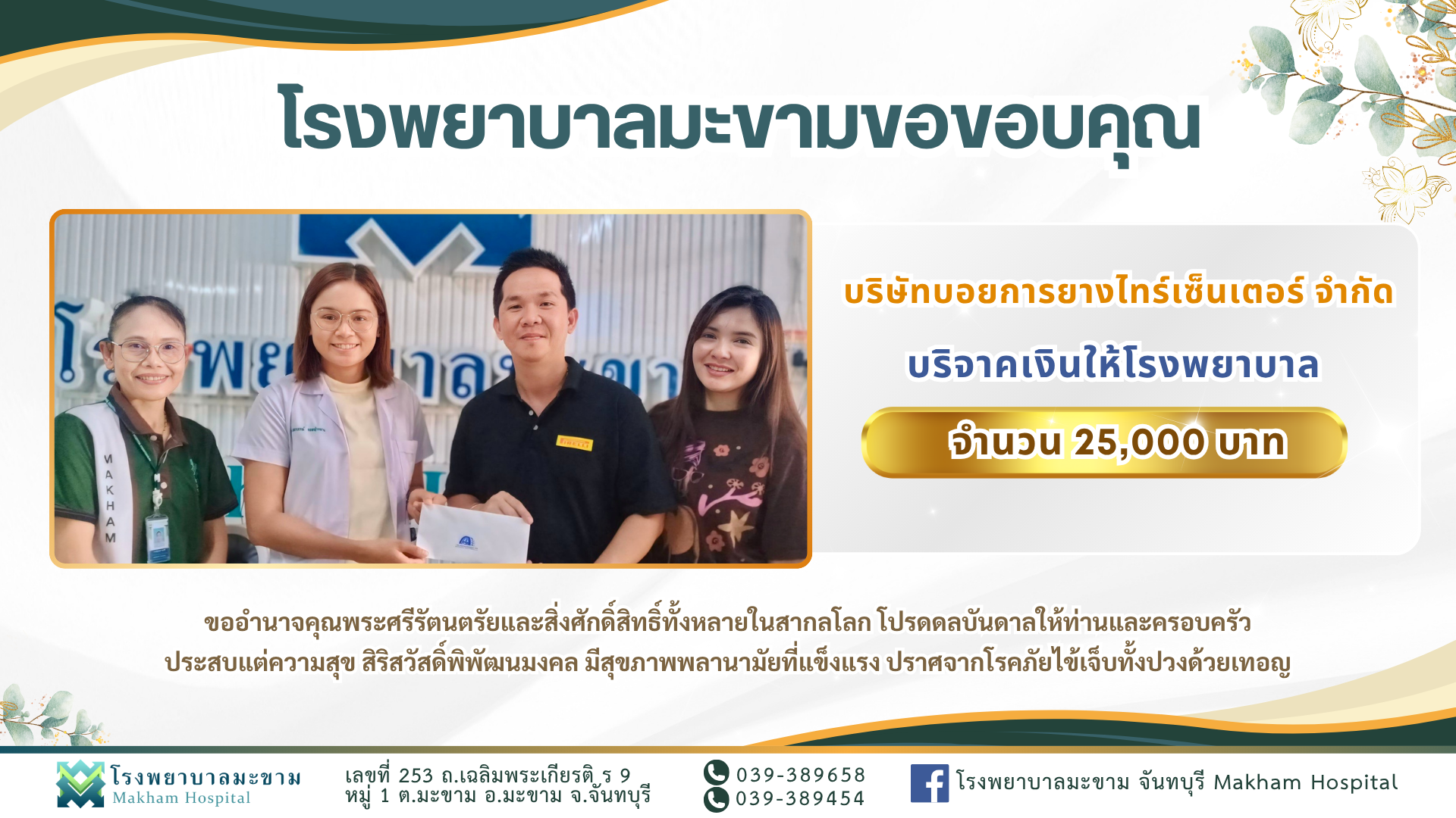 โรงพยาบาลมะขามขอขอบคุณ "บริษัทบอยการยางไทร์เซ็นเตอร์ จำกัด บริจาคเงินให้โรงพยาบาล จำนวน 25,000 บาท "