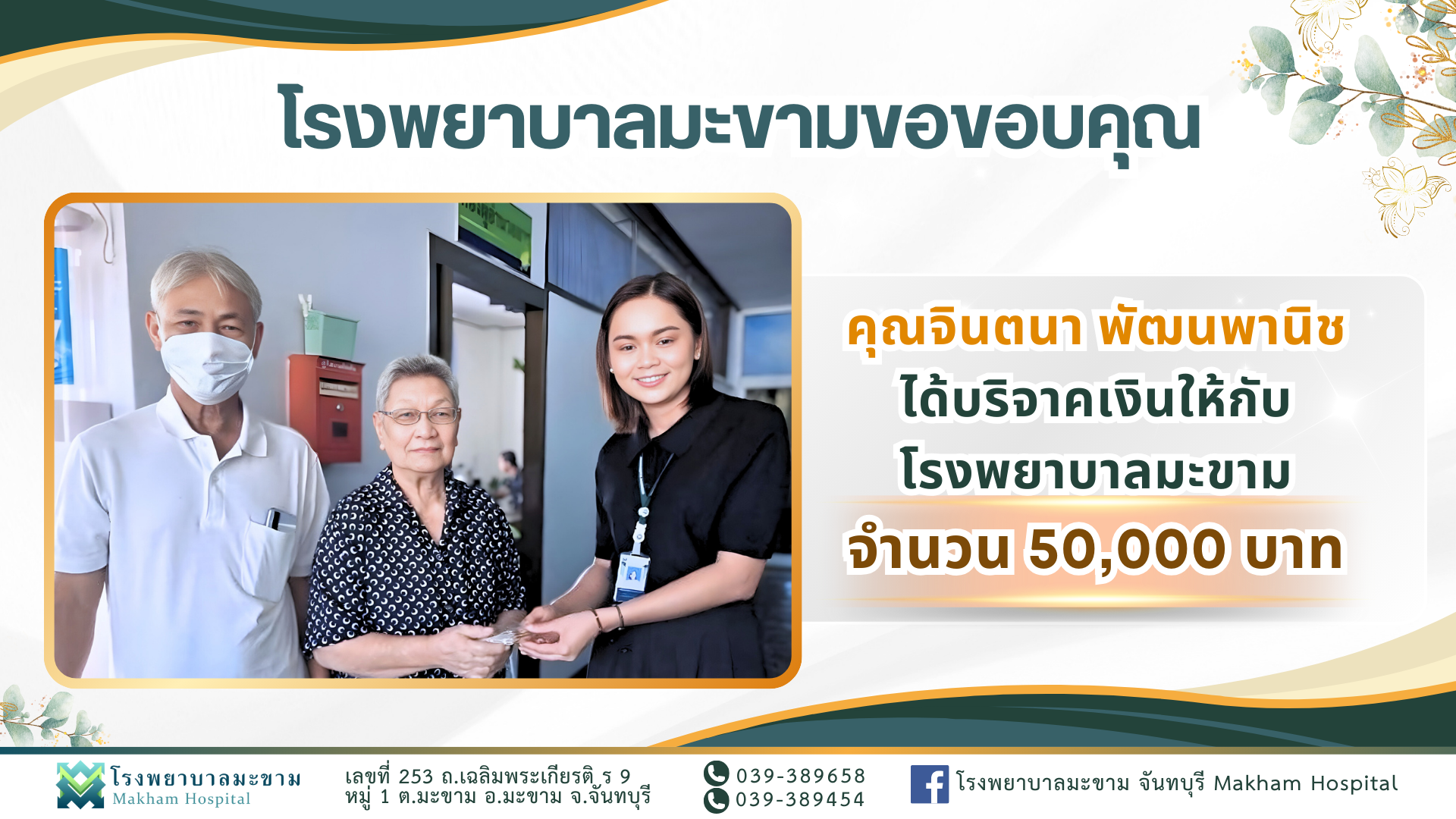 โรงพยาบาลมะขามขอขอบคุณ "คุณจินตนา พัฒนพานิช บริจาคเงินจำนวน 50,000 บาท"