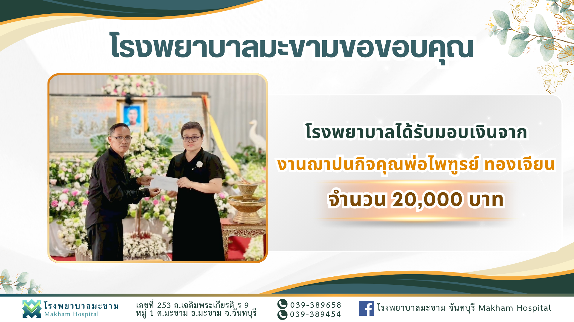 โรงพยาบาลมะขามได้รับมอบเงินจาก"งานฌาปนกิจคุณพ่อไพฑูรย์ ทองเจียน จำนวน 20,000 บาท"โรงพยาบาลมะขามขอขอบคุณค่ะ